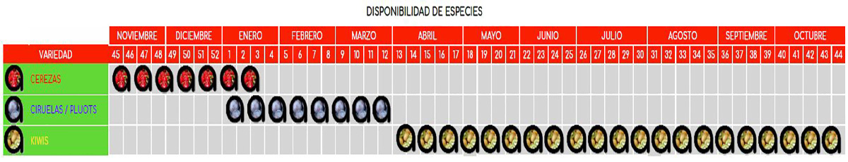 Contamos con productores desde la V hasta la VIII región del país, lo que nos permite alargar las temporadas de fruta para así proveer a nuestros clientes en el extranjero en forma confiable y consistente, además de alargar las temporadas en cada fruta y así poder surtir de manera segura y consistente a nuestros clientes en el extranjero.